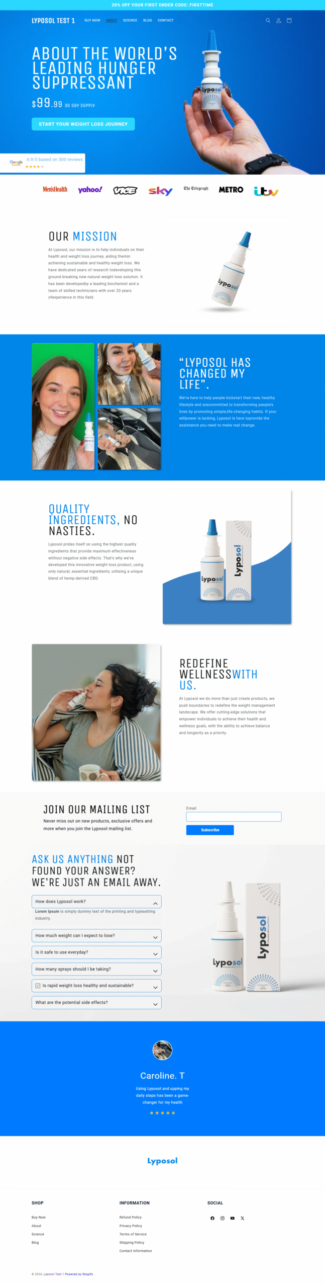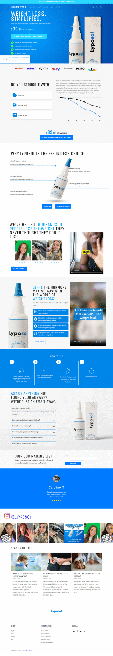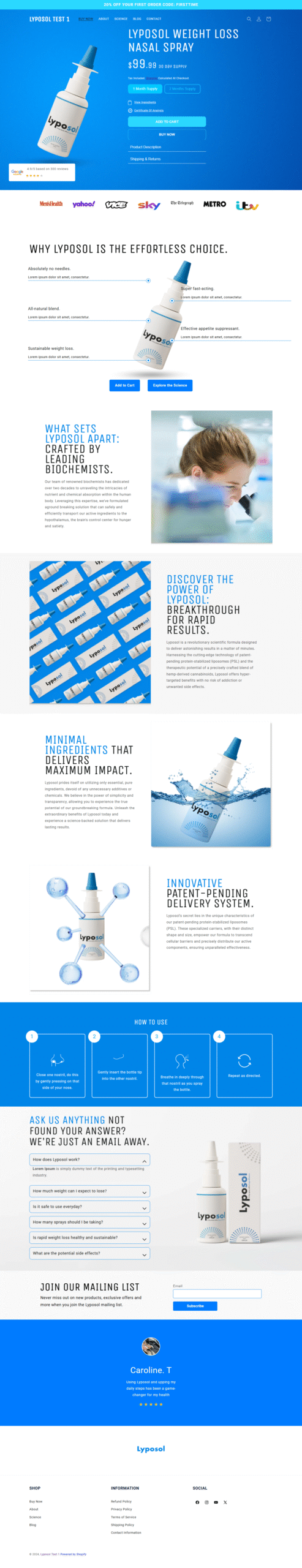 For the Lyposol project, I developed a custom Shopify theme using the Dawn theme as a foundation, translating a Figma mockup into a functional, responsive e-commerce website. The goal was to create a seamless user experience across all pages and devices.